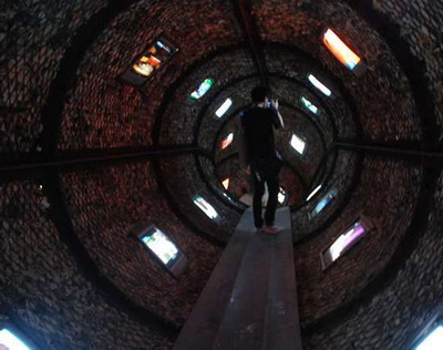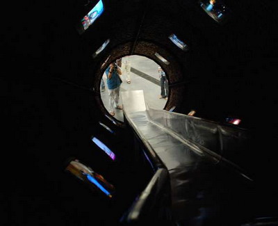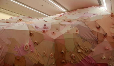 尹秀珍是一位特别的坚持将布料转化为雕塑媒材的艺术家,《内省腔》是她这一系列中最新的作品。这是一间巨大的,帐篷形状的作品,使用颜色鲜艳的旧布料装饰外观。作品的内部是一个柔软的空间,柔和的流水声帮助参观者获得一种精神上的平静。艺术家创作这件作品是为了提供给参观者一个安宁、和谐的体验,使都市人尝试远离钢筋水泥的丛林,在此反省个人的希望、回忆和理想。