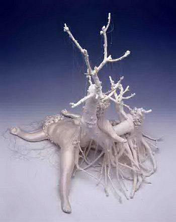 这些作品中的女性躯体略显臃肿,或可称为丰盈,一如鲁本斯油画中的壮妇。她们有自己的语言,即使没有面孔和表情,也拒绝服饰。就那样摆着不同姿态,暧昧而语焉不详的静谧存在着。如何去描述人与一棵树的关系?与一头野兽的沟通与对峙?这是一个女人鲜活的生命,一具凡人的躯体,血肉、骨骼、皮毛、躯干交织覆盖了命定的界限,你、我、他、她和它,都难分彼此地混生一处,是无数异化重构的造境现场。没有面孔却仿佛看到无数的面孔,看到千百种的表情不断变化更新又消失不见,没有死亡,一直在重生,在生命与生命,生命和物质之间从未停止过转换,时间凝固的瞬间,我们看到这热烈却又宁静的转