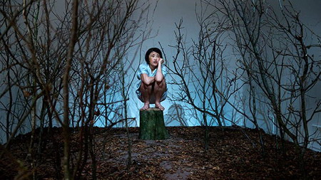 你需要弯下腰通过一间小门,门的另一边充满了神秘的朦胧光线;一片树林在其中投下了毫无修饰的阴影,一个中国女子在这片阴影中安静地低声吟唱——看起来像是她在等待你的到来一样。
