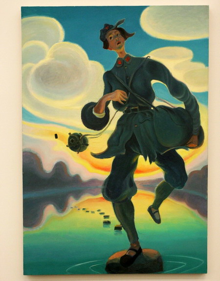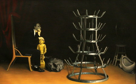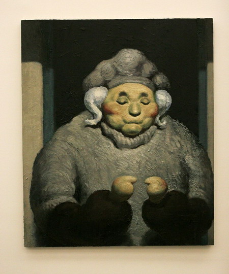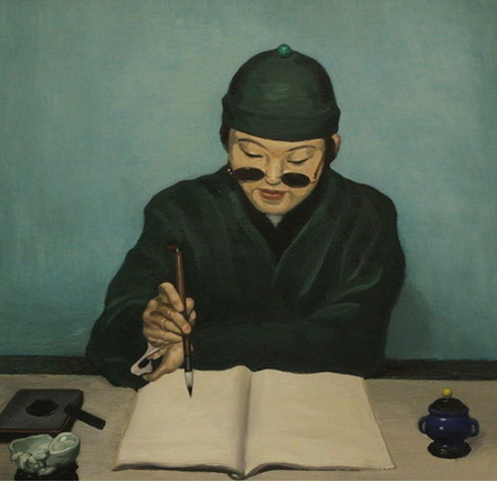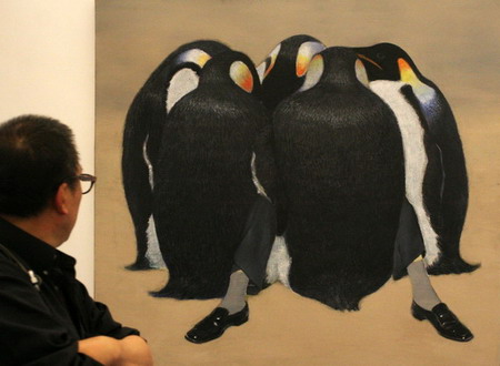 作为生于六十年代的艺术家,王兴伟早年生活在沈阳旁的小城海城,他通过不同对艺术史图像的截取和使用,不断追问艺术家自我的身份认同。在2002年迁居上海后,在带有偶然性的尝试后,王兴伟在绘画载体上进行了一系列实验。同时他的创作在对于图像样式的不同重复中建立全新的场景。而从取材自考前班广告的阳台老太太,到取自1989年社会事件中的新闻图片中伤员而演变来的悲伤的企鹅,王兴伟通过他跳跃性的对图像的选择与重复,加之其对文本的拆解重造,呈现了一个敏感且富有深厚想象空间的幽默世界。