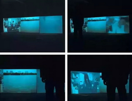 屏幕A的影像是一男子在书房里面窗而坐,手持钓鱼杆悠然垂钓;当观众靠近时,书房水汹涌地注入书房至充满,人、物和空间处于水下状态;当观众离去,一切复原为水上的常态。屏幕B 的影像是一处平静的水面,远处的河岸线的景色为小桥、亭台楼阁和高楼建筑群;当观众接近时,河面上远近各处有鱼跃出水面,水面上涟漪连连。观众离去即恢复平静。屏幕C 的影像为水下情景,当观众出现时水下有潜泳者进入画面,有的是经过画面、有的带有表演倾向、有的处于挣扎状态。观众离开观看区域潜泳者游出画面,水下恢复宁静。
