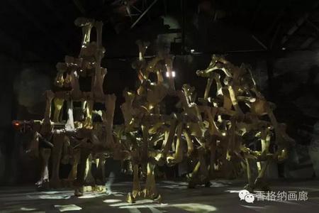 《太极》是一件集影像和机械传动装置于一体的综合媒材作品。作品的装置部分是一个生物体,这个生物体由220多根按比例放大的人体骨骼组成,在一个自动化控制系统中按缓慢的速度在空间中自由行走,传感器检测空间中的具体位置,控制着作品的行走轨迹。在生物体内骨骼中安置了总计108台投影机,投影机投射出来自历史和现实的影像,这些影像经过主观的处理和改变,就像进入我们记忆系统的史料,经过“过滤”从“骨骼中回放出来,与骨骼的异乎寻常的缓慢运动形成叙事关系,在空间中产生特定的场域。