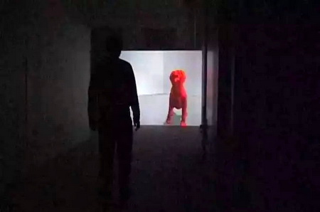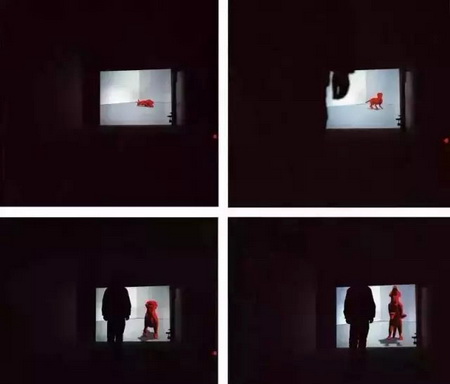 投影机从背后将一条处于睡眠状态的狗的影像投射在屏幕上,屏幕竖立在展厅门口。当观众进入展厅时,狗起身警觉观望;观众靠近,狗进攻性地冲过来并狂吠;观众再逼近,狗后退并作出妥协姿态,回到原处继续睡觉。