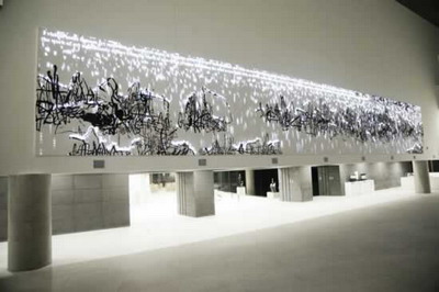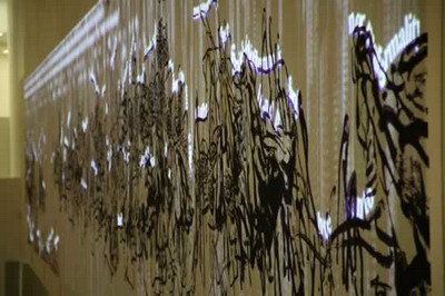 作品说明:作品基底是一幅经放大印制的中国水墨,投射在水墨上的是作者的文章“论西方现代艺术的边界”。动态投射的英文文本不仅像雪花一样源源不断地输入和照亮中国水墨,在注入的同时,也不断纷纷解构成片段,像雪花一样纷纷散落,像积雪一样落到中国水墨画成的荷叶上,又随之逐渐消融。这样一种动态的过程,正是现代性“西学东渐”的写照,从西方的角度来看,不断地传入,不断地输出,从东方的角度来看,不断地吸收,不断地消化与消解于无形,本体始终存在。从超越东西方的角度来看作为一个整体的作品,可明确辨识的不同“身份”和谐共存,“和而不同”,并未呈现出此消彼涨,非此即彼的态势,而是共同呈现出异样的东方式的诗意。观众在观看作品时,既可以感受到雪天的凉爽,又可以感受到荷塘的气味。