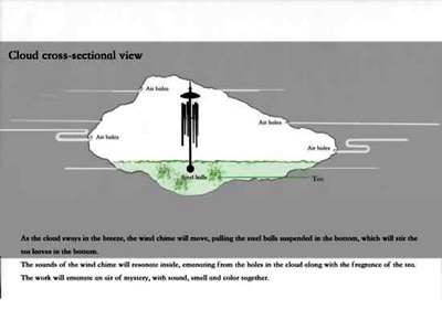 作品说明:主体云朵以不倒翁结构置于草地上,可随风摆动。云朵内部悬挂风铃和茶叶,风来云动,茶香与风铃声一并传出。漂浮云朵表面用茶薰香后的棉花塑型于白色气囊表面,内充氦气,悬浮于草地上空2-4米处,可保证人在下面穿行。目的要在中国馆门前制造一种具有禅意空灵的梦幻气氛。