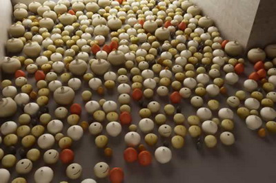 作品说明:将中医古方烧制在外形像埙一样的瓷罐的内部,瓷罐的外面配以传统手绘图案。大小两种罐子摆出各种形状,每一位观众都可以带走一个小馆子作为礼物。除了中药气味之外,瓷罐里空无所有。以此装置来揭示中医原理和它的当下遭遇:根据中医理论,包括气脉、经络、穴位等在内的我们认为不可见的东西都是可见的,但是将不可见的转变为可见的中医理论对于今天的大多数人来说却是不可见的。