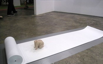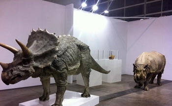 一层的头两排仍主要由国际大牌画廊把守:Lisson Gallery、White Cube、TOMIO KOYAMA GALLERY、Gagosian Gallery等等,来自中国的画廊,如长征空间和唐人当代艺术中心也占据了非常有利的位置。在VIP预览之夜,White Cube画廊便开始了骄人的销售业绩,Tracey Emin的作品当即卖掉,而在此后三天,更两番更新已售出的Gary Hume作品;长征空间也在开幕伊始便迅速地售出了王思顺、喻红等人的作品;唐人、常青、站台中国与ART ISSUE PROJECTS联合推出孙原&彭禹的作品,四组玻璃钢制成的三角龙与犀牛,并组合以骨头或昆虫标本分布在四个画廊,造成游览的错觉(如图);TOMIO KOYAMA GALLERY推出的奈良美智小画幅作品备受欢迎,TN-P-D-11-32等系列作品以单价39万港币的价格售出;Annely Juda Fine Art以125万港币售出了Anhony Caro一件1971年的作品;位于三层的ShanghART Gallery、Boers-Li Gallery等亦有不俗成绩;位于一层的大未来林舍画廊在预览之夜便将带来的刘炜画作全部售出(如图),同样带来刘炜作品的还有三层的AYE GALLERY,不过销售情况不及前者理想,但他们带来的陈文骥的小型装置作品则卖出了多个版本。