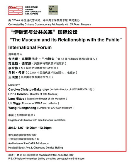 2012年11月7日上午十点,由中央美术学院美术馆和CCAA共同举办的《博物馆与公共关系国际论坛》在中央美院美术馆学术报告厅举办。此次论坛由中央美院美术馆馆长王璜生主持,共邀请到四位国际知名馆长、策展人以及收藏家围绕博物馆如何运作,怎样处理博物馆与公众关系等问题参与发言讨论。