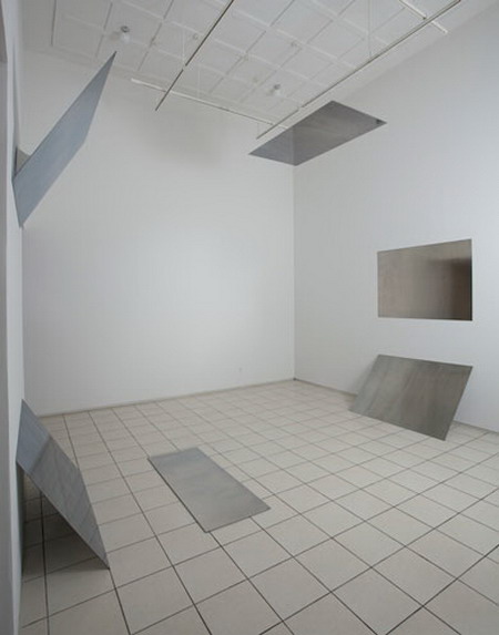 EP:正是这样。结果我们就看到了这样一种模糊但反射性的表面,周遭的环境就映照在了作品上。另一方面,作品中的东西又反馈回建筑的空间内。这样,这些作品聚集着物理环境的物理痕迹。随着气氛、房间环境的改变,最终我们会看到表面上细微的变化。这某种程度上就像是Downsbrough作品的反面。Downsbrough的作品是不变的,迫使你思考你身边的环境。(而利兹的作品)有一种吸纳周边的环境的感觉。