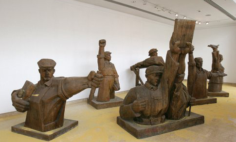 王广义在北京昌平的一个别墅区买了两栋房子,打通后作为自己的工作室,门前草地上摆放着他的雕塑《唯物主义者》系列,铸铁,锈迹斑斑的工农形象,个个浓眉大眼,踌躇满志,顶天立地,誓将日月换新天的精气神,都像刚从“文革”的海报上走下来。据说物业开始不让摆放这些废铜烂铁,觉得有碍环境,后来知道这是一著名艺术家的著名作品,才态度陡变,说这么摆着挺好。
