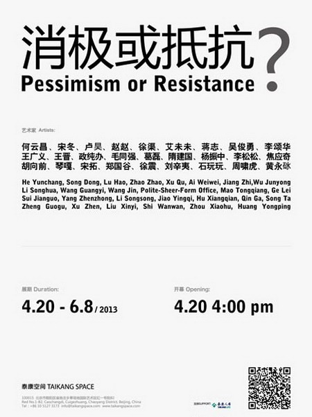 今天一切都被笼罩在“泛政治”之下,但“消极或抵抗?”这个展览更多是关于现实层面上的、可见的政治。这里的“消极”和“抵抗”不指涉作品分类,也不指涉艺术家的创作强度,更不作为理解展览的关键词,它是抛给艺术家及观众的一个问题,即在关于政治的艺术视阈里,作为艺术家与观众的我们,还能做些什么以及怎样做?展览试图呈现艺术家们在涉及这一题材的创作中,关注对象与符号的变迁,以及这一话题在艺术家创作中如何处理、呈现以及他们二者之间的影响。希望借此展览能唤起业内对此一话题的探讨与热情。
