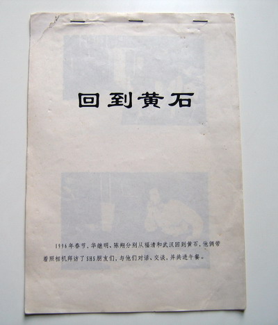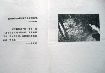 小时候我和同学经常到湖边画水彩画,湖不大、水很清,周围有很多树,给我留下很深的印象,1996年我给陈翔说起那个湖,想到湖边走走聊聊天,去了以后我大失所望,清清的湖水没有了,被黄石电厂倒入的废煤渣淹没了,变成了一个煤湖,我看了以后就想跳入煤湖的冲动,我飞翔试的跳入煤湖之中,我的身体慢慢地被稀松的煤泥陷了下去,我会死的,生存的本能使我抓住了一小树枝,我爬了出来,事后陈翔问我为什么要跳湖,我回答:“正因为跳下去不知道是生还是死,有我意料不到的东西,我喜欢。那一瞬间,我感觉日本俳句大师松尾芭蕉有一首优美的短诗是为我写的。 (文/华继明 《关于十年来的行为》)