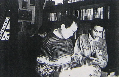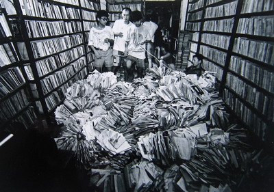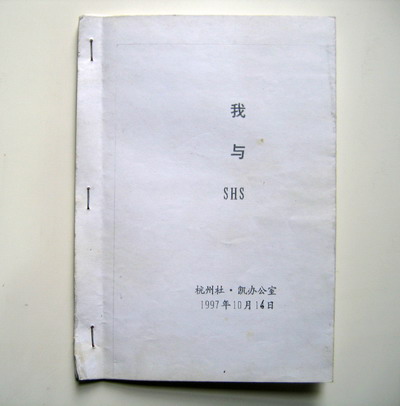 有一天中午,我在家阳台晒太阳,突然有点做什么事的强烈愿望,就找到一堆书和一根绳子,我半个小时把每一本书用一枚大钉子打了一个大洞,用绳子穿过。做完以后我满头大汗,然后把一绳子的书吊在阳台上随风吹,风带走了一页又一页。这次穿书的实验,导致我想用一根绳子穿越阿根廷布宜诺斯艾利斯国立图书馆所有藏书的想法,当然博尔赫斯所在的国立图书馆藏书没有被我用绳子穿掉。但1994年我和SHS小组成员一起穿掉了黄石新知书社所有的图书。几乎所有的书籍都是性质混乱而且无形,形形色色都有。且包含着同样书籍的要素、空格、句号、逗号。每一本书在所有的书里窜改,书粗糙不平的外表看起来像一个策略,上万册书堆起来像一座山,以此暗喻当代社会和文化的复杂性。 (文/华继明 《关于十年来的行为》)