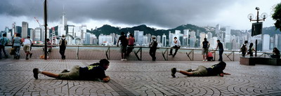 第四次爬行是2002年6月,我特邀参加香港反战艺术节,晚上我在香港文化中心剧场请美国音乐家一起完成了《乱敲乱唱》的行为。第二天,我沿着香港文化中心外围,做了一次爬行的行为。
