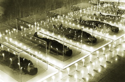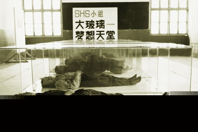 我们将近三个月的准备,跑遍了黄石所有的展厅,准备各种材料,我们做了6个大玻璃空间,每个玻璃空间180/45/60厘米,每个大约60公斤,相当重。直到最后都没有解决玻璃透气的问题,整个表演,分白天和晚上两场。晚上SHS小组成员裸体钻进六个大玻璃空间中,展厅内很静,我们在玻璃空间中直到呼吸困难为止,头脑发晕、眼睛发黑、四肢无力,烛光使演出者具有殉道者的精神,展厅成了一个大教堂。构成了一幅人类远古焦虑的图画,整个演出最好地表现了SHS成员渴望在内心达到自在自为。在演出后许健留下了这样一段文字。《大玻璃》的行为不是一种图腾式的生命崇拜的参照物,也不是艺术家设立的作为重新对生与死这一人类主题在认识的虚假灵堂,简单地说,这只是行将贯穿艺术生活的无数次行动的射影,从一定意义上讲,它起到了一个释放艺术家和其作品能量的作用,这种释放能量的多少,同时也成为决定并衡量艺术家自身状况的尺度。 (文/华继明 《关于十年来的行为》)