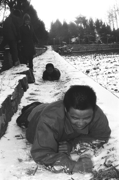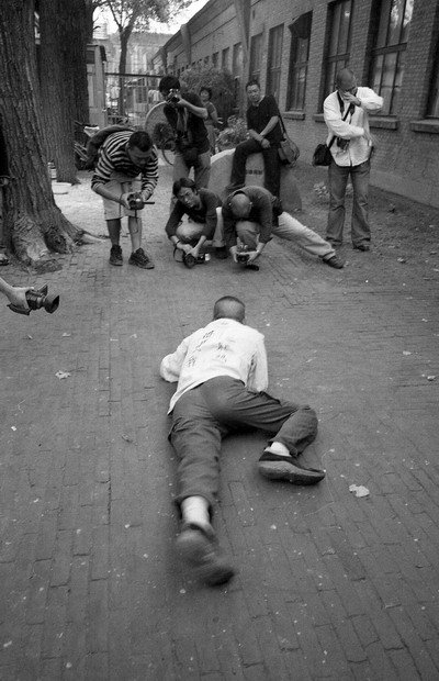 第三次爬行是2001年12月,北京下了一场大雪,我在雪地里从西海子公园门前向燃灯塔爬去。有几个小孩在雪地里打雪仗,他们也加入了我在雪地里爬行的行列,使这次行为有了不少童趣。这次行为我双手都冻僵了,双膝和双肘都磨破了,疼痛难忍,我是连滚带爬完成这次行为。