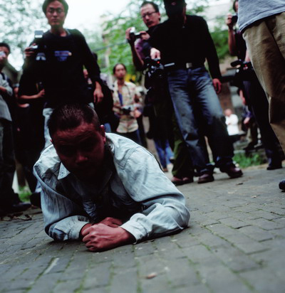第五次爬行是2003年9月,我参加现场艺术节,我在北京东京艺术工程画廊外爬行,留下很多意味,爬行也使自己身体很脏,最后用清水冲洗全身,整个过程是一次静心和洗脑的过程。