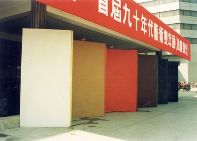 1992年我和三位朋友一起成立了“SHS”小组,同年。吕澎策划了九十年代广州双年展油画部分,展览明确规定作品尺寸不能超过2米,这直接导致我们做一件大作品的想法。我们4人背着大包来到广州,在广州买了12块大三角板,把油画颜色还原成单纯的十二种原色,制作在这12块大板上。这件总长16.8米的作品《十二色》。使展览组织者带来不小的麻烦,这么大的一件作品没法进入展厅,最后只能在展厅外展出,展览组织者说来自湖北的四位小伙子做了一件这次展览最出格的作品。 (文/华继明 《关于十年来的行为》)