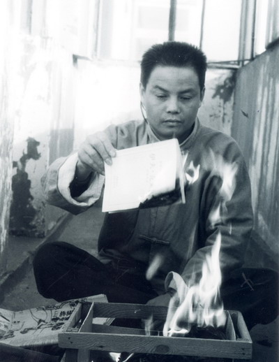 2001年,开始我用肢体语言做爬行,一共做了五次行为。第一次是2001年4月,我在北京住的滨河小区做的,我从一个空矿的房子爬行至阳台,葡匐进入另一房间钻入堆满垃圾的废塑料地板下,在垃圾之下顶着压力艰难行进,等待我的是一锹锹扑面而来的生活垃圾,裹夹着是令人窒息的尘土,铁锹与水泥地面剧烈地碰撞着发出刺耳的声音。这时由于我的匍匐前进,双肘早已难以支撑、疼痛不已,接下来的尘埃、泥沙倾泻而下汗水湿透衣襟,我在垃圾尘埃中难以呼吸,突然双眼一热,泪水涌出,放声大哭。在场看我表演的妻子和几个朋友也感动得掉下了眼泪。