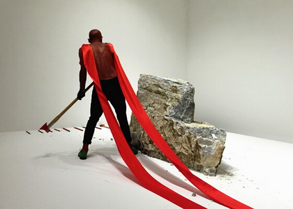 与网络的互动被更多的艺术家所采纳。今年的8月,艺术家刘成瑞身着红妆,银钩穿过双肩的琵琶骨,在上品艺琅的画廊中“耕作”,累了就睡在“红日”上。每日重复劳作,碎石几十块。成长在青海的刘成瑞,从小的生活中就有神话、草原、雄鹰这些元素。而穿琵琶骨是他从父亲处得到信息,“古时穿了琵琶骨的大多都是不好的人,它是一种审判,也是一种牵制。”这种“牵制”与“审判”,刘成瑞用两条红布链接天花板,似乎在诉说生活中的很多事情也许“冥冥之中有天意”,但刘成瑞本身每天碎石的工作又是与之相抗衡的。他将自己和劳作工具涂成红色,自己、生产工具、太阳都是红的,有人将这红色看做是政权,有人看做是阶级,有人看做是“动力装置”。在艺术家高氏兄弟看来,刘成瑞以劳动方式实施的碎石行为,在唤起人们久远追忆的同时,更激发人们对当下劳动者真实处境的关照与思考。