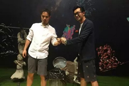 ▲双飞成员与今日美术馆馆长高鹏在擂台撞蛋中