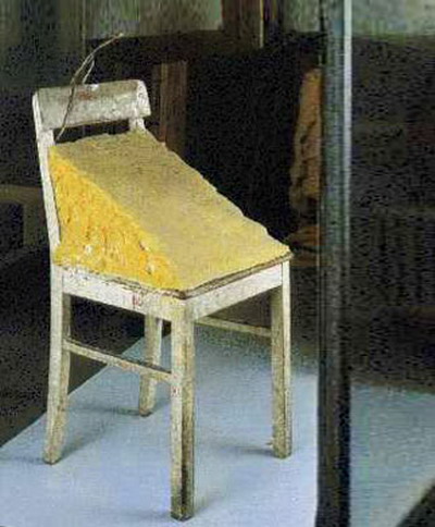 又如约瑟夫·波依斯(Joseph Beuys) 的有机分解的雕塑作品油脂椅子(Fat Chair),作者选取了个人偏好但同时具有流动性和不确定性特点的媒材(油脂、蜂蜜、动物身体等)之一:油脂。“油脂象征着死亡与再生,以及怜悯的可能”。这件作品的保存也面临难题。