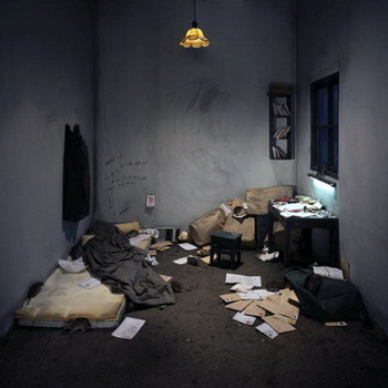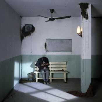 总是有一些粘稠的不详的液体反复出现在陈维所拍摄的静物和场景中。它们是被钉住翅膀如同燃烧般的血液,是手提箱洒满的白色和黄色混合的粘稠液体,是广播站中叮满了蜜蜂的黑色流淌物,是床铺上掀开被子处露出一小滩猩红的印痕,是地毯上不可避免的大片晦暗的油污。这些温温的湿湿的肮脏的液体仿佛携带着腐臭,隐隐而来,那些引人猜测的莫名的来源更使这些印记触目惊心。这些人留下的不可洗刷的痕迹,使人不禁怀疑在这无人的房间里似乎曾经发生过什么?而这种粘稠的流淌则成为一种污秽的感觉的暗示,成为内心的隐秘世界和外在直观物的连接剂。有机的液体成为一种附着在现实之上的软体,暗示着一种身体不可抑制的自发的排泄。