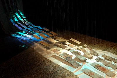 女人河 装置+声音 旧搓衣板、渔线、丝绸、水纹灯 1200x120x300cm 2005 陶艾民