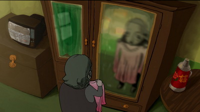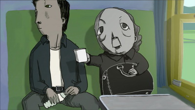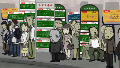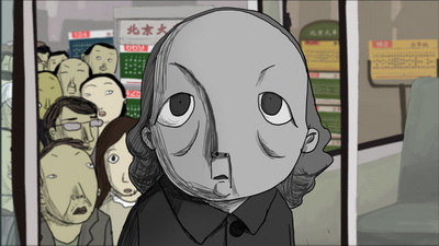 无交互状态下,画面中的角色在无声的状态下做着一套动作,并且循环往复;当观众选择画面下方的汉字后,声音出现了。同样是这个人物和这套动作,在不同的选择后,出现不同的人物话语发音,于是,人物的身份立即被确立了。那么,这个人究竟是谁?就像电影蒙太奇一样,相同的角色与不同的声音组合后,这个角色变得多义和暧昧起来。