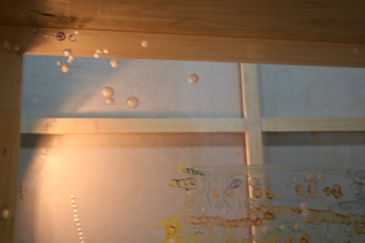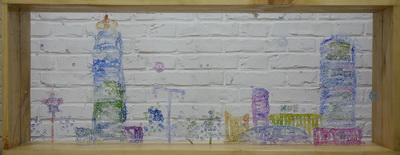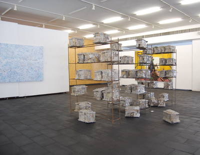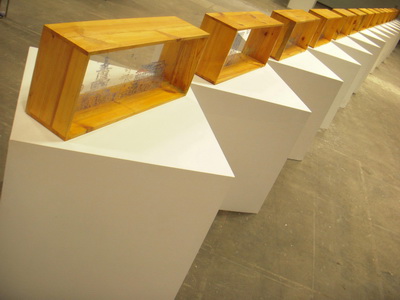 在《黄盒子。平方。玻璃??街》这组绘画装置里,强调划刻的结果,飘渺的尘埃颗粒被装修的各种型号的电钻眼所代,夕日破碎的青花瓷片与粉彩,构成的画面;原本的无形在作品里变得更加无形。玻璃上面呈现的中空,凝结成气泡状,一旦有微风带来的温度,这些形体将随之蒸发并散去。