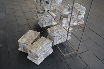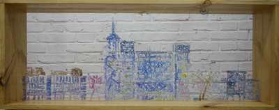 这样,浮华世间沉重肉身;被缕缕血丝隔断并连接,人类变得更加窥视与漠然.《痛》系列中的点点细胞如今变成了颗粒,灰尘,沙子,水泥与砖块,静脉与动脉变成了岁月的裂缝.转着圈圈的时空螺旋成为医生的放大镜继续检验着楼体的淤血.这又将成为历史的坐标,一时间成为软体分子并等待着一阵风,哪怕是一丝微风,将之挥发到时空中去,伴随着??古街上人们的朝九晚五成为一种时空遗憾;温情早已将我,我们,你,你们,他,他们,颗粒般的反射于时空之中.