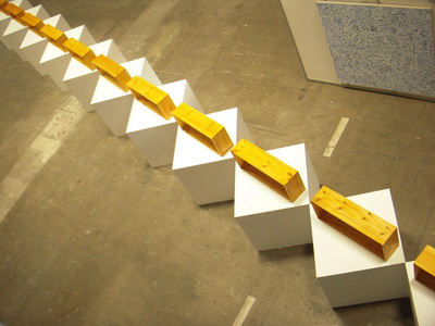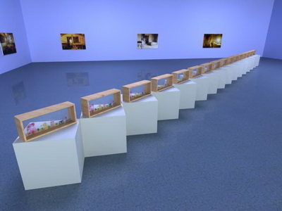 〈〈黄盒子。平方。玻璃??街〉〉再现的是??街——一条中国的古街,随着历史的推演,街的东西两方正在不断延伸扩展着.推向西方更推向东方,作为中国的名街,也是中国最伟大与最平庸的百姓日常生活的一面镜子之街.在建国后的几时年里,这条街不知拆了多少历史坐标,也不知又盖了多少大大小小的高光建筑.我所描绘的是??街这种高反光建筑,它代替了建国初期的钢筋水泥的厚重,用轻铝合金之类的新材料所取代的高反光建筑.久远的木制结构楼舍消失了,冒着节油与不节油的大奔驰马路,高反光建筑也将人们的温情以透明的冰冷手法隔开.在有你我的身影里只有窥视与漠视,眼睁着却看不清也不知另一个世界.高光玻璃建筑将人们以有的温情反射掉.时代将中国这条最古老最繁华最平庸与最伟大的,大事小事不断发生的名街渐渐的被物化掉.木制楼舍最终被灰色水泥代替,灰色又被合成的高反光玻璃演化.总之温情变得越来越少.我们被不断扩张的城市及不断演化的日常的大街小巷,就这样把我们一块一块的隔开了,隔成孤独,隔成抑郁症,隔成痛并快乐着,隔成高光反射下的一座活体雕塑,木制空间的温情成为今天的灰色,白色式无情.