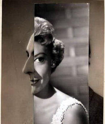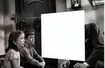 斯蒂扎克试图将人们对于机械图像所造成的第一感觉戏剧化,无论他采用何种方式来实现这个目的,这些方式总是与一种变化交换的愿望联系在一起。用他最近在一次访谈里的话来说,这些方式往往反映了“艺术的一种天启可能性:艺术可以简化为从媒体图像中削减的过程。”《面具》(Mask,1982)系列就有力地体现了这种减法方式:传统的头像照片上放置了风景明信片,这些明信片既是对那些缺失的头像片段的补充,也在以令人头昏目眩的方式瓦解着这些头像。比如,在《面具4》(Mask IV,2005)中,格雷戈里•佩克(Gregory Peck)的脸部变成了一个阴暗的山洞,这个山洞的边缘正好与他脸的轮廓重合,从而将他的脸变成了一个非人的深坑。在《电影肖像》(Film Portrait, 1979)系列中,这种妙不可言的图像双关和不知所云的差异得到了更为充分的彰显。斯蒂扎克将不同演员的面部拼接起来,这样就轻而易举地产生了一种怪诞的图样(特别是他所创造的性别调和)。而《白板14》(Tabula Rasa 14,2008)则采用了一帧电影片段(一个穿西装的男人的头像,他正在和两个全神贯注的孩子说话),并且用一大块带透视效果的白色四边形进行了遮挡,从而也遮挡了这件作品的意义。