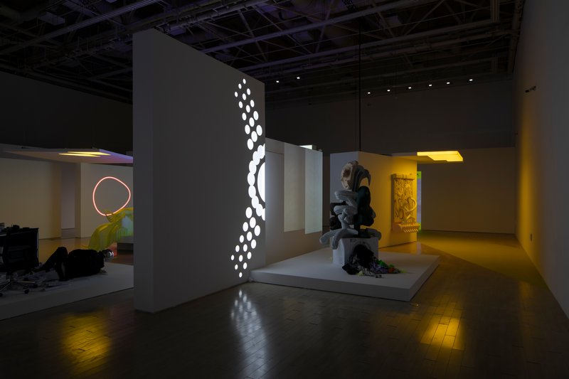 展览将这一逻辑转译为空间结构,整个现场被构建为可循环的模块系统。影像、雕塑、绘画与灯光作品被置入统一的光源与秩序之中,形成彼此独立又相互联动的感知节点。观众在其中行走、停留,如同步入一套被配置好的“疗养套餐”,在不同单元之间感受节奏、强度与密度的变化。