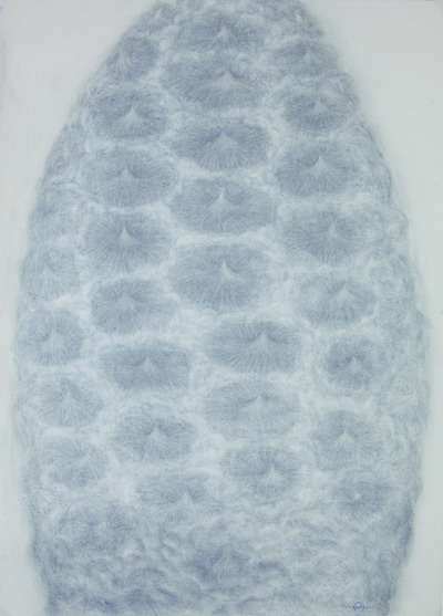 运用最为朴实的绘画工具——艺术家竹子在纸上用炭条和繁复的铅笔线条,清淡蓬松的笔触, 将盘结的鱼团,规整的毛竹,围堤中的桃园等自然之物进行一场场人造的带有超现实意味的排演,把观众带入他制造的带有东方美学的非叙事性的诗意中。