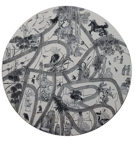 岳敏君_迷宫系列-五十以学_布面油画_直径200cm_2011