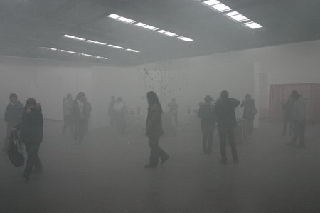 A:我很喜欢徐弘滨的作品《样本空气》。他用空气压缩机在鸟巢附近分别存入两组空气,一组是奥运会前几个月的空气,另一组则是奥运会结束之后的空气,让观众在现场体验这两种气味的不同之处。之前北京的空气污染很严重,在奥运会期间因车辆限行之类的措施而使空气有所改善,但闭幕后又回到原先的污浊。他借用不同时期的空气对比反讽了一种“面子工程”的虚假。他突出了气味本身的表达,虽然也有“视觉”的材料和元素在里面,但这都是为了辅助于气味。这场展览强调的另一个重点是,我们的目的不是为了创造嗅觉这个艺术媒介,而是通过这个媒介去表达对现实的感受。另外,这场展览不仅有美好的气味,也有让人焦虑的气味。艺术家杨放制造了一个夸张的汽车车祸现场,通过干冰释放的烟气在整个展厅中营造出一种强烈的危机感。还有艺术家谭海山的作品《晏子使楚》,他透过狗的嗅觉这一“视角”来看人的环境。本来现场就有各式各样的气味,狗在现场对不同气味的反应成为作品本身,巧妙地“借用”别人的作品来创作。