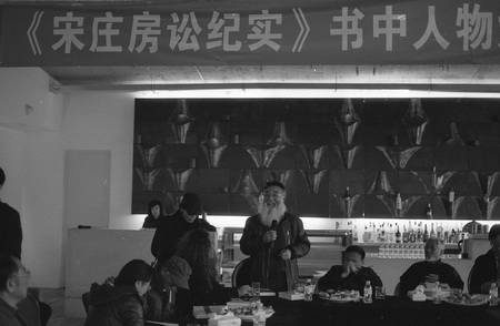 2005 冯国东一生贫困,只在生命的最后两年作品才卖出像样的价格。图为冯国东追悼会栗宪庭致悼词,并写挽联:“劣质烟高度酒贫困骤断英雄梦 巧匠心能工手孤独终铸艺术魂”。