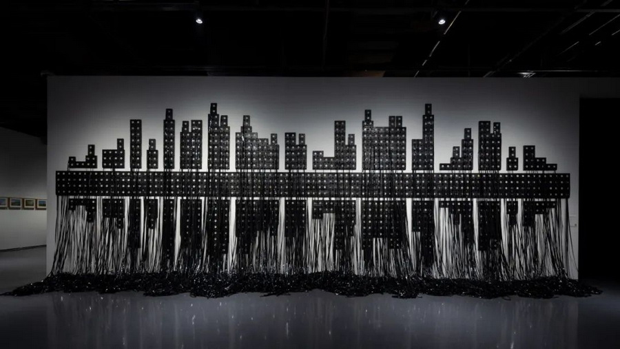 媒介的转变正是为了超越对物理城市的再现,服务于观念的隐喻化表达。以穆尼尔·法特米的装置作品为例:它用展开的VHS录像带构建了成都的天际线及其倒影,材料本身就带有记忆与连接的隐喻。艺术家并非精确描绘城市外貌,而是通过这种抽象形进行寓言——城市中所有的居民、楼宇都是彼此相连的整体。我们不再处于精确再现的层面,而是进入了隐喻与象征的领域。这件作品正是通过物质媒介的转化,构建了一座关于关联、记忆与社区精神的、无具体疆界的“精神之城”。这正是“梦想之城”版块的核心追求。