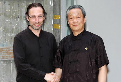 书法家巩法根(右)
