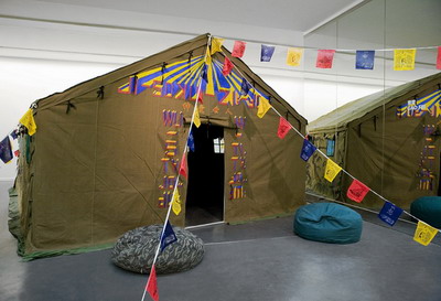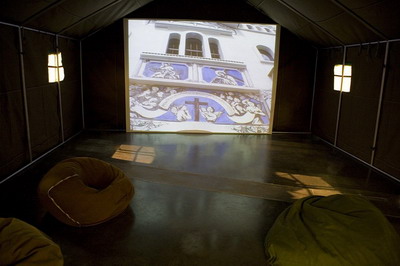 曹斐《怒》,2007 帆布帐篷、彩旗、懒人沙发、视频(58分钟)、投影尺寸不固定 展览现场摄影师/唐萱 图片由尤伦斯当代艺术中心提供