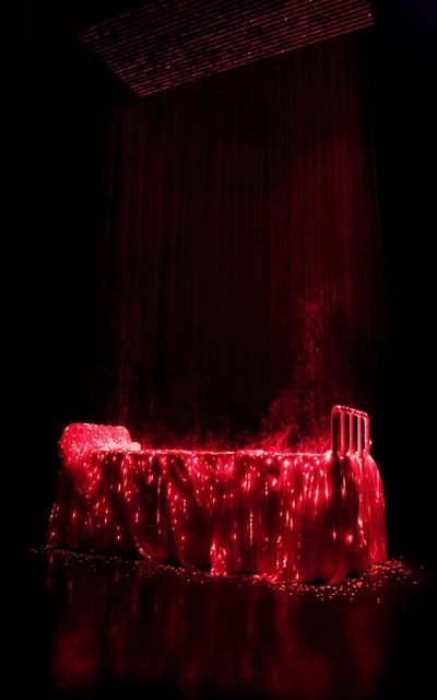 李晖《轮回》,2010 激光、金属、烟雾、布 200 x 110 x 410 cm 展览现场摄影师:唐萱图片由尤伦斯当代艺术中心提供
