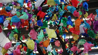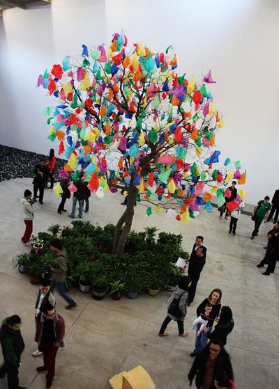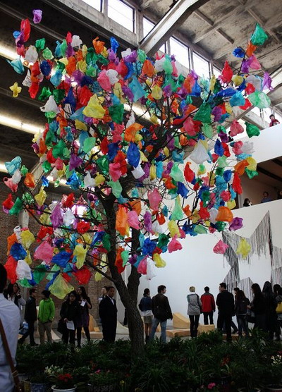 帕斯卡尔·马尔蒂那·塔尤(喀麦隆1967,生活工作在比利时根特)在利用他回收的现存的事物、社会垃圾,赋予它们第二次生命,表现以分解/改造为主旨的过程。为此次展览构想的作品主要材料是塑料袋:艺术家环游世界时收集的普通的彩色袋子。它们被系在一棵树上,如同它的树叶。塑料袋是一种没有地域分界的极其普通的物品,在世界各地都能找到,而且同样有用和无用。塔尤对它的特性十分感兴趣,它是永久的盛载工具,还具有矛盾的双重用途,有时是有产阶级的物品,有时是无产阶级的。用来装购买的物品时是有产阶级的,空了时是无产阶级的。“它毫无用处,毫无内容,根本无法丰满”,艺术家如此形容。