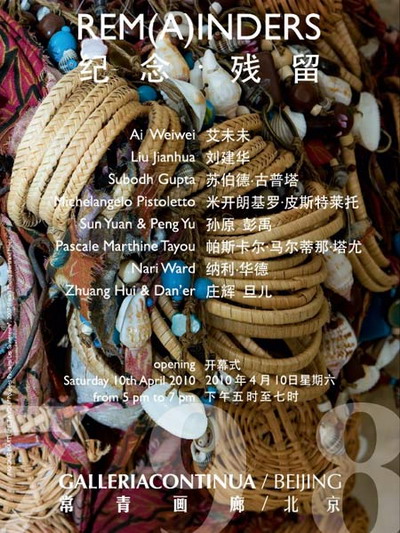 2010年4月10日(99艺术网,金程) 今日下午5点常青画廊隆重的在北京798艺术区献上一个特殊的群展《纪念·残留》,此次展览展出的是一些国际艺术界中顶尖艺术家的作品。本次参展艺术家共10位,他们均是:艾未未、刘建华、苏伯德·古普塔、米开朗基罗·皮斯特莱托、孙原,彭禹、帕斯卡尔·马尔蒂那·塔尤、纳利·华德、庄辉,旦儿。艺术界众多知名人士、媒体、画廊工作人员、学生等前来观展。开展前,众人围堵在常青画廊的门口期待5点的到来,势必给路人的感觉:这是一场不可错过的展览。