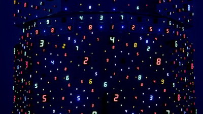 宫岛达男的很多作品中都采用了精密的LED设计,使从9到1(或从1到9)的数字——人类最为通用和极简的语言,循环跳转。有时它们会同时熄灭,使整个房间浸入一片黑暗,但是在他的作品中却从未出现数字0,因为艺术家认为0意味着否定,否定了人类存在的无限循环,艺术家以让0缺失的方式引发更多对于虚无的思考。