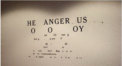 走出电梯,来到第14层楼的第一个房间,首先看到的是丽贝卡·利布(Rebecca Lieb)创作的一件墙面作品。利布使用了詹姆斯·弗兰科(James Franco)在Clocktower画廊举办的展览“The Dangerous Book Four Boys”中的墙标,她将一部分字母的标签取走,以形成一种不同的含义。仅仅是詹姆斯·弗兰科这个名字就似乎已经把我送到了一个想要大叫着跑向远处的漩涡中,因此我一下子爱上了这件作品。不过让这件作品更有魅力的一点在于:摩根史丹利公司的logo模糊——甚至是幽灵般地出现在了一面垂直的墙上。