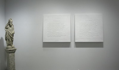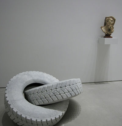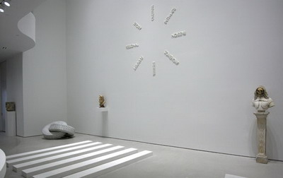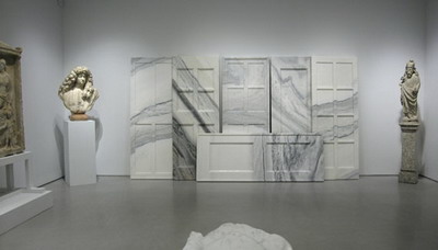 大理石是雕塑创作中最古老、最基础的原料之一,它在艺术、装置艺术以及建筑中都得到了广泛的使用。在这场展览中展出的现代及当代雕塑作品则为这种古老的材料提供了一种不同的环境。作为达达运动的先锋,让·阿尔普(Jean Arp)在1941年时创作的作品“Mediterranean Sculpture I(Orphic Dream)”,这是一件具有生物形态的雕塑作品,它具有圆滑而有角度的边缘,表现了这位艺术家试图合并自然的不同形式的欲望。理查德·朗(Richard Long)的作品“Heaven(Portrait of Carl Andre)”(2011)由六条大型的大理石块组成。法比奥(Fabio Viale)的作品“Infinite”(2011)则是由大理石雕刻而成的两个交缠在一起的轮胎。瑞士艺术家Not Vital的“1/2 Man 1/2 Animal”(1996)是一件足有11英尺高的人形雕塑,它看起来像是一种神秘的生物。艾未未的作品“Marble Doors”(2007)由5块大理石板组成,形成了一个由白色和灰色的门板组成的屏障。汤姆·萨克斯(Tom Sachs)的作品“Brute”(2009/2010)则将一件普通的物品通过大理石这个媒介变得不普通了。在作品“Purity”(2008-2011)中,Barry X Ball通过非常规的石头和方法的使用为古老的雕塑注入了新的活力。