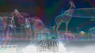 Miao Xiaochun presents "RESTART" and "Disillusion." The former is a three-dimensional animation in which Miao explores human existence through a comprehensive and emotional journey. Set to the score of Beethoven's Missa Solemnis, "RESTART" is a visual symphony in which the characters travel through time and space, referencing the canon of art history. Meanwhile, "Disillusion" evokes Kafka-esque surrealism as the artist delicately presents the fragility of human life through a dance of virtual figures made of disintegrating linear elements and spherical forms.