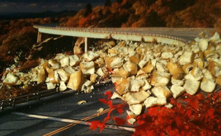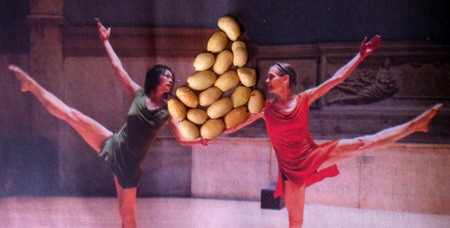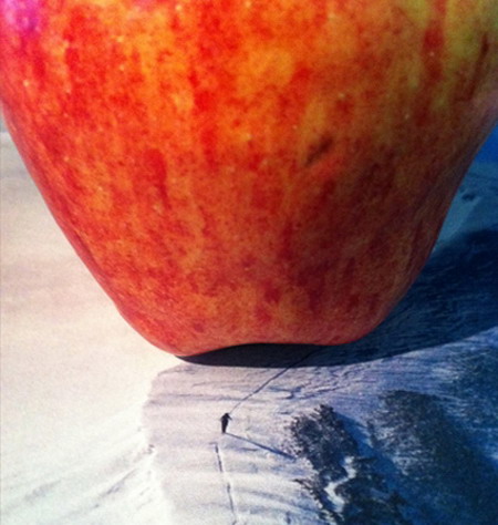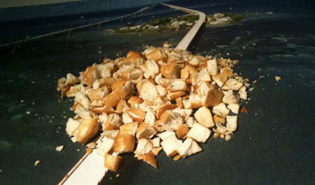 正如这场展览的名字所暗示的那样,“Lavatory Self-Portrait in the Flemish Style”系列使用了诸如充气颈枕、餐巾等尼娜(Nina Katchadourian)可以获得的材料创作出了弗兰德斯风格的自画像。旅行杂志为艺术家提供了一些更为丰富的材料。来自“Landscapes”系列中的一件作品就利用了黑色的毛衣线头将一座被雪覆盖了的山头转变成了冒烟的火山。在“Disasters”系列中,面包屑又变成了冲毁了道路的滑坡。黑色线头同时还出现在了系列作品“Birds of New Zealand”中:它装饰了那些异域之鸟的脑袋和身体,赋予了它们更精致的外观。这些作品最奇特的地方还在于它们看起来都如此可信。尽管道路上的石块很明显并不是真正的石块而只是面包屑,又或者现实生活中的鸟的头部显然不可能有腰果状的附属物,但这些作品都产生了一种真正的暂停感,让人们觉得它有可能是真实的——尽管这是荒谬的。