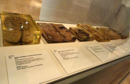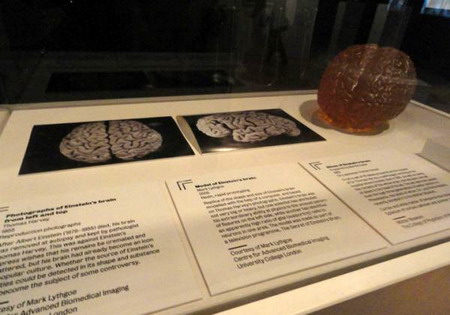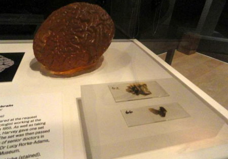这个展览收集了150多个展品,包括真的脑子,与脑子相关的艺术品,手稿,视频,照片等。说到真的脑子,这应该算是我长大以后第一次看见,隐约记得小时候去过什么历史自然博物馆,看见过,但实在印象不深了。这次我看到的第一个脑子样本是海豚的脑子,好大呀,而且和人脑长得非常像。其他的脑子样本都是人脑的,看起来都差不多,但这些脑的主人却相差悬殊。名人的脑子包括:爱因斯坦的三个脑切片,Charles Babbage 和 William Burke的大脑;也有普通人的大脑,比如来自帕金森和阿茨海默患者的脑子。